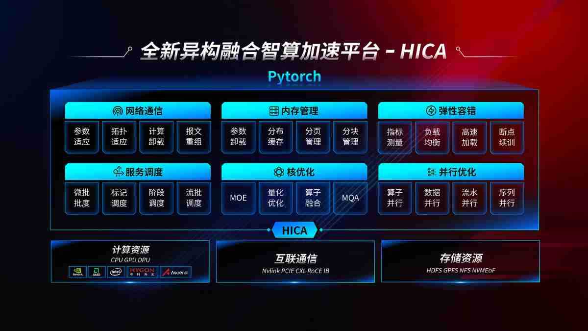 通过自研的服务层、、、中间适配层、、、以及调度编排算法,,,,采用数据并行、、模型并行等多种并行方式,,把并行计算任务进行有效的分解,,,,使其分别由相应的软件栈和算力资源来承接。。当GPU资源变化,,,HICA可以实时动态调度计算子任务并调整模型拓扑和架构,,以充分聚合各种算力资源。。。