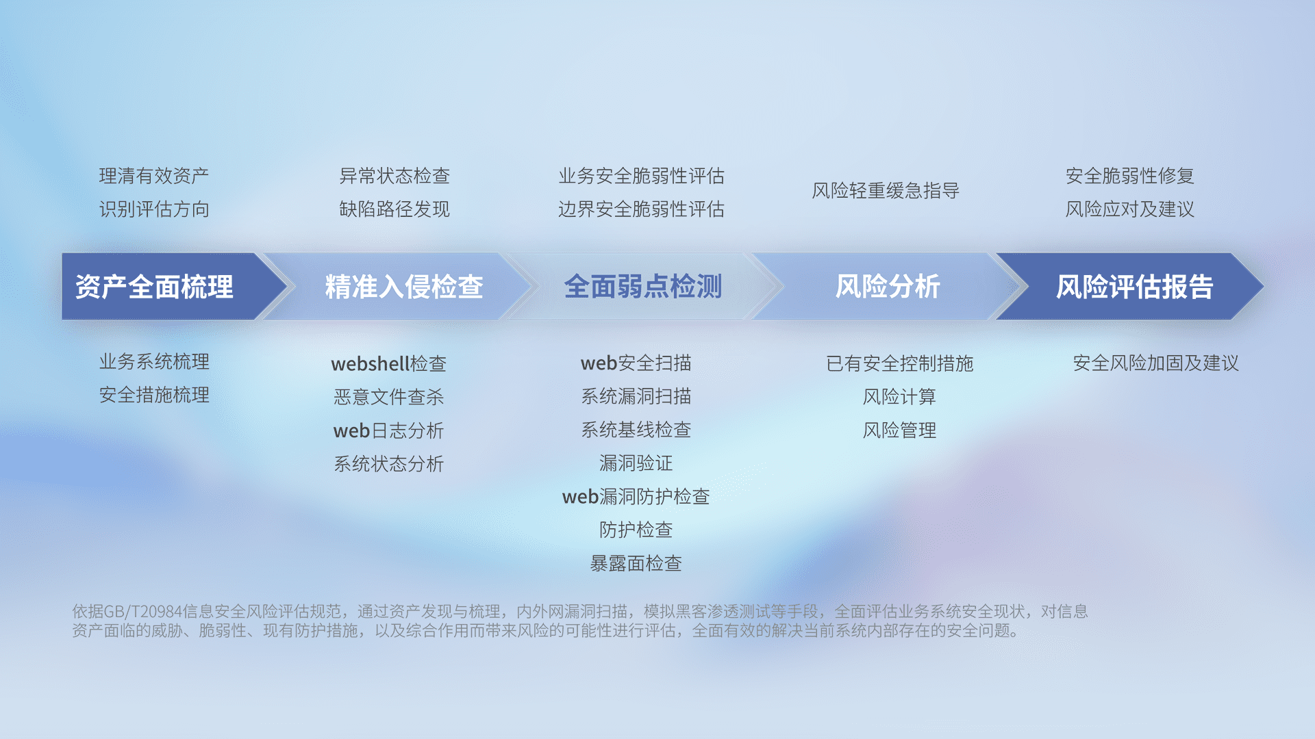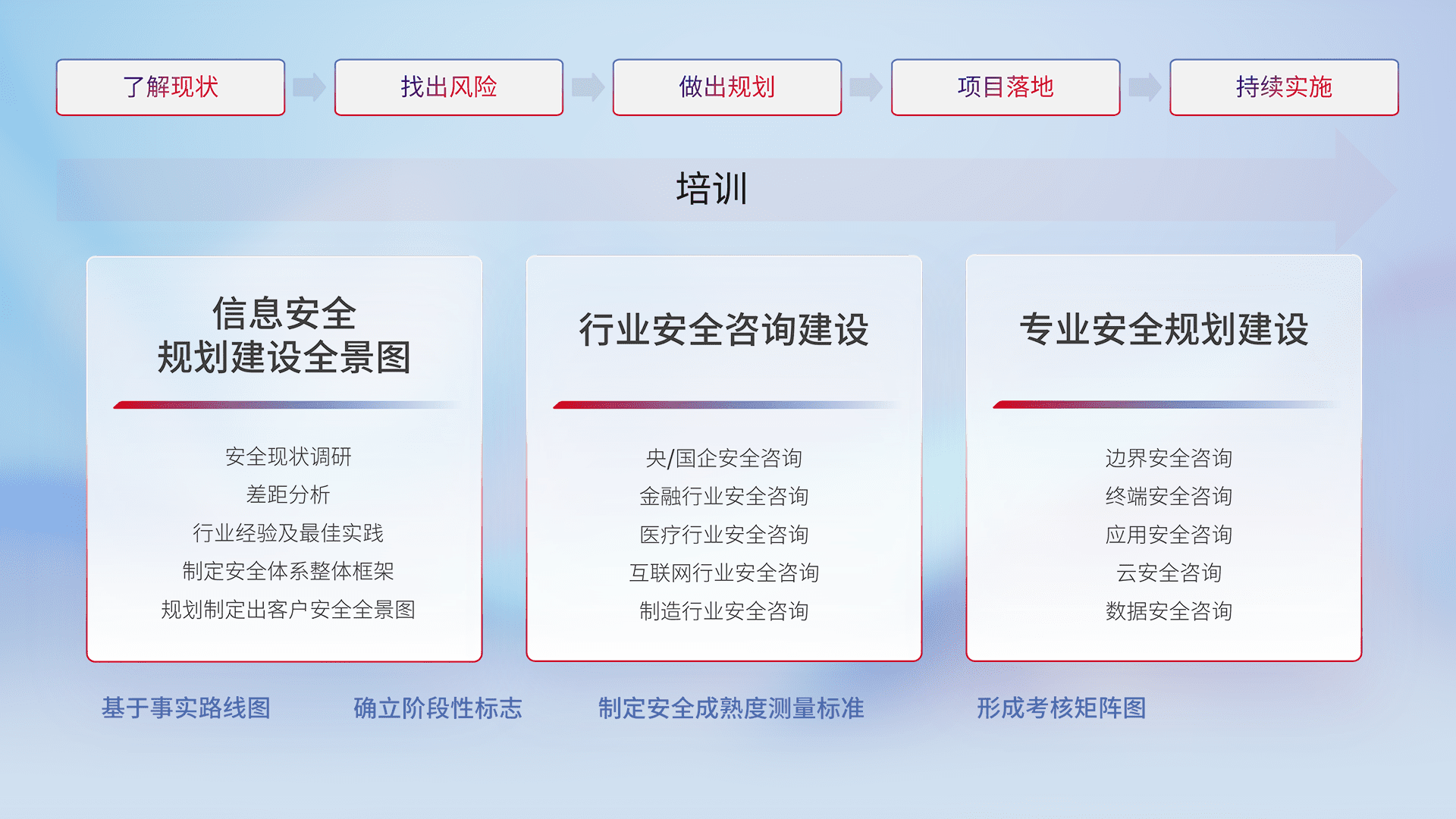 针对客户行业特性,,,,以专业的安全服务+多厂商联合解决方案提供专属的一站式安全管理服务,,,,帮助客户全面感知网络空间威胁,,,基于识别、、检测、、、、分析、、、、防护、、监测、、响应的服务理论模型,,,,从方案咨询、、、集成交付、、、、评估验证、、优化加固、、、运维运营,,致力于为客户提供完整的闭环管理式安全服务。。以实战经验为客户打造高抵御风险的安全体系,,帮助客户发现威胁、、对抗威胁、、、、处置威胁,,不断积累安全对抗能力,,,,持续保障数字化安全。。。。