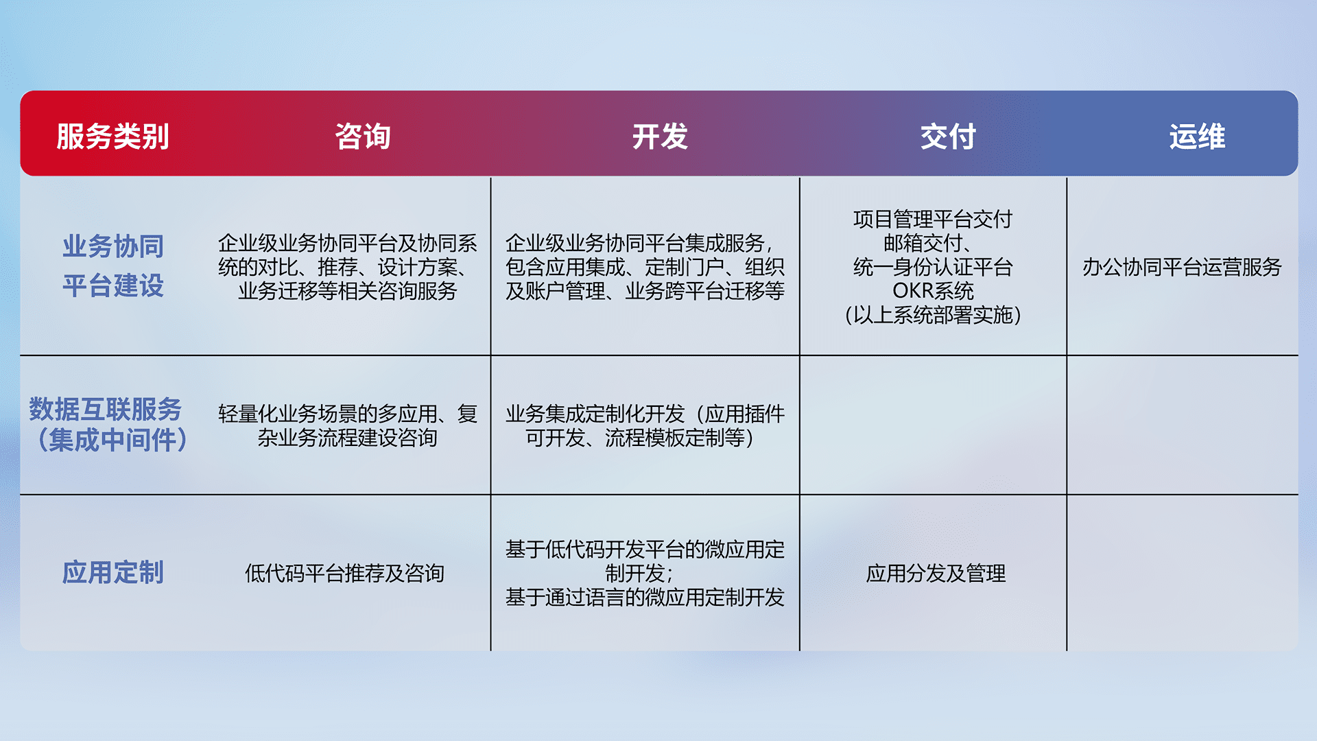 针对钉钉、、企微、、、、IDaas等平台级产品提供产品的规划、、、、方案、、交付、、、定制化开发等服务,,,,实现如统一协同办公、、、、智能客户服务、、、混合会议管理、、、、智能数据查询、、、等业务场景,,,,实现数字化转型。。。。